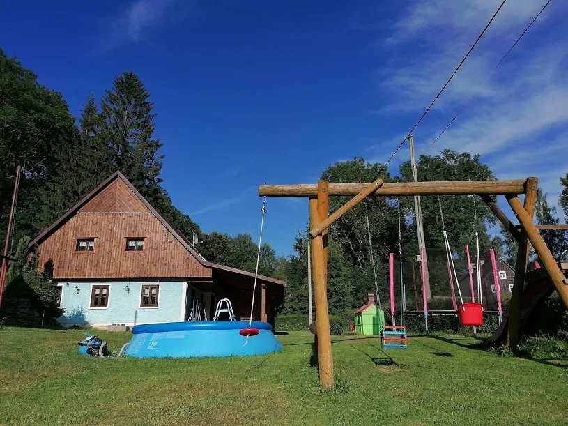 To pravé kouzlo se však skrývá venku. Chalupa stojí na samostatném travnatém pozemku, který je doslova nabitý aktivitami. Zatímco dospělí odpočívají pod krytou pergolou u zahradního krbu, děti se mohou vyřádit v zahradním domečku, na pískovišti, houpačkách nebo na velké trampolíně.