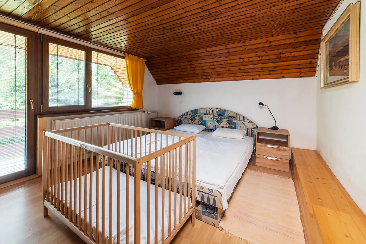 V patře se nacházejí dvě samostatné ložnice. První ložnice disponuje manželskou postelí, palandou a dětskou postýlkou. Druhá ložnice nabízí manželskou postel a dvě samostatná lůžka. Mezi pokoji se nachází průchozí místnost, která slouží jako dětská herna plná her a knih, nebo jako plnohodnotné místo pro Home Office díky psacímu stolu a barevné laserové tiskárně.